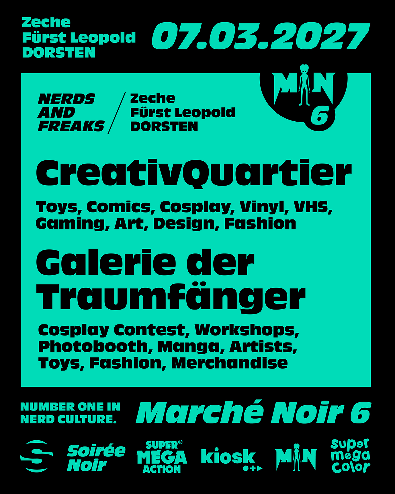 Als stimmungsvoller Vorgeschmack auf das Marché Noir-Event, welches am 07. März 2027 im CreativQuartier und in der ‚Galerie der Traumfänger‘ der Zeche Fürst Leopold stattfindet, verwandelt sich das Einkaufszentrum für einen Tag in einen Treffpunkt für Nerds, Fans und Neugierige aller Altersklassen. Zwischen Mode, Technik und Gastronomie sorgen zahlreiche bekannte Helden und Kultfiguren für eine bunte Abwechslung im Shopping-Alltag.